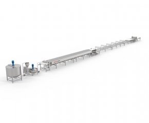 概要信息:自動化鮮河粉生產線采用攤漿蒸熟工藝原理制造。適用于非發(fā)酵工藝,熟化度98-100%,水分60-64%,厚薄度1.2-3mm,寬窄5-20mm鮮濕河粉的生產。本產線具備成熟而完備的磨漿、調漿、布漿、蒸熟、冷卻、切條工序,各工序,自動化集成度高。