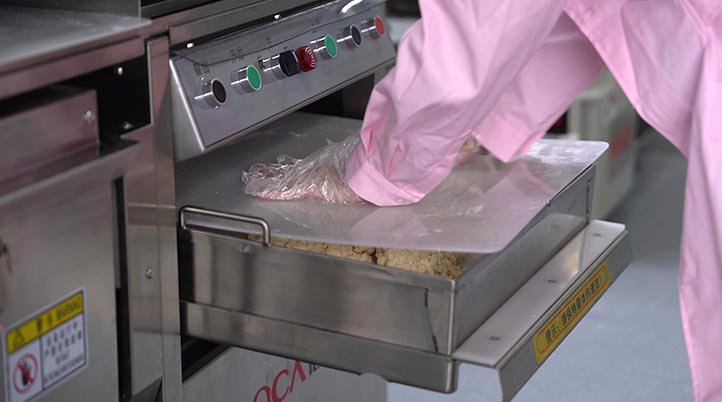 -壓面裝置重現(xiàn)了傳統(tǒng)“手揉”面團的完美力度,將醒好的面團放入壓面裝置中,進行壓面。