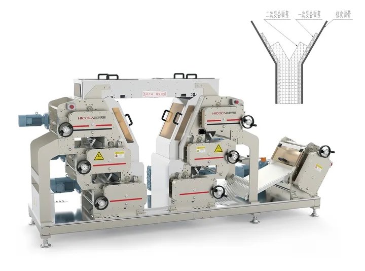 片絮復(fù)合壓延技術(shù)的靈感來源于市場(chǎng)上一些作坊的制作工作,他們每次在壓延出來的面帶上都會(huì)均勻撒上面絮,再進(jìn)行壓延。這樣的制作工藝在市場(chǎng)上得到了認(rèn)可。但是傳統(tǒng)做法效率慢,勞動(dòng)強(qiáng)度大,也無法保證面條質(zhì)量能夠做到標(biāo)準(zhǔn)統(tǒng)一,更無法保證食品衛(wèi)生安全。把民間的好工藝融入到智能裝備中,實(shí)現(xiàn)安全、標(biāo)準(zhǔn)生產(chǎn),這是海科佳的出發(fā)點(diǎn)。