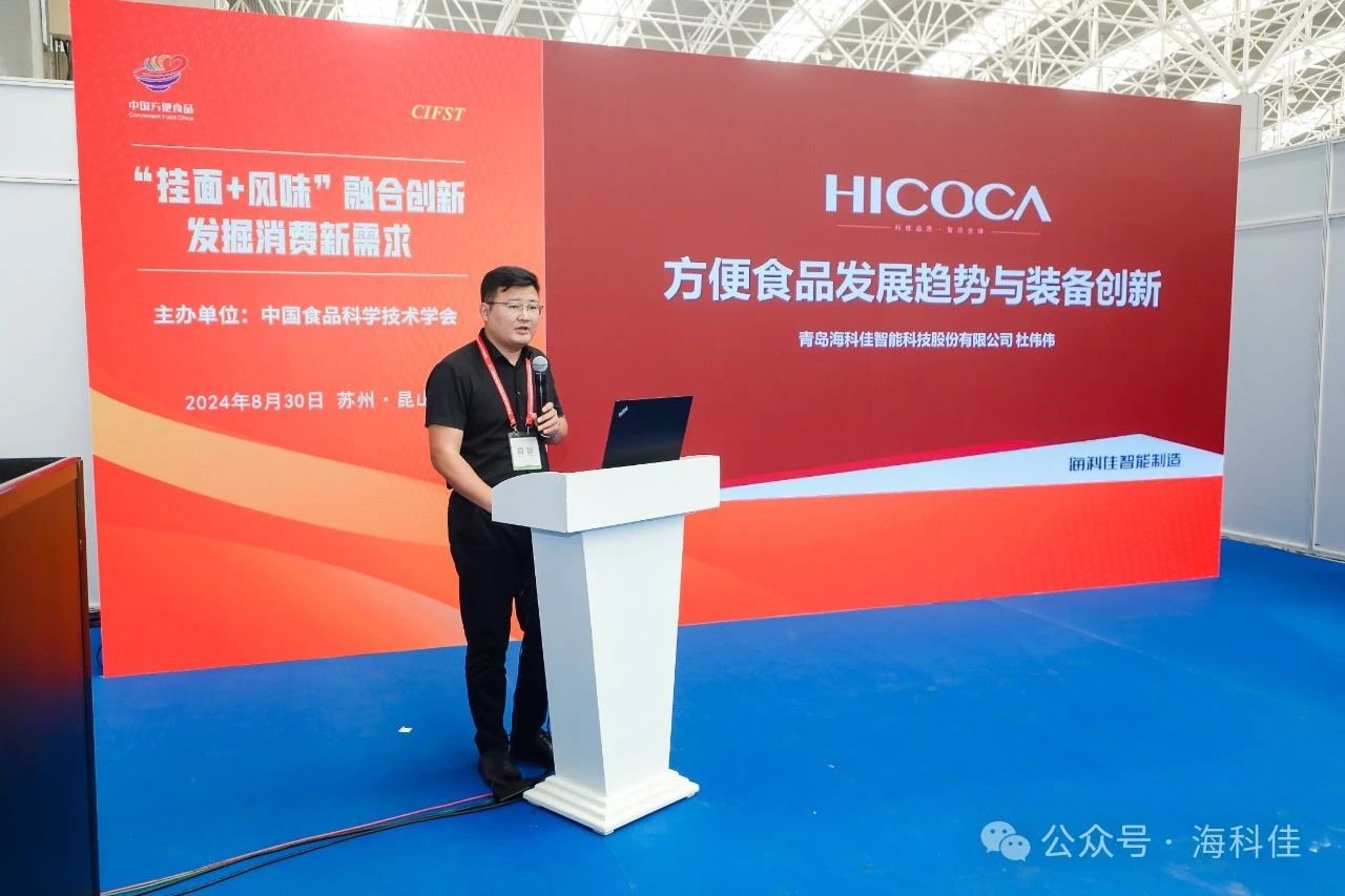 青島海科佳在“專題二:掛面+風味融合創新 發掘消費新需求”中作了題為《方便食品發展趨勢與裝備創新》的報告。向與會人員介紹了海科佳近幾年開發的米面制品新產品、新技術。